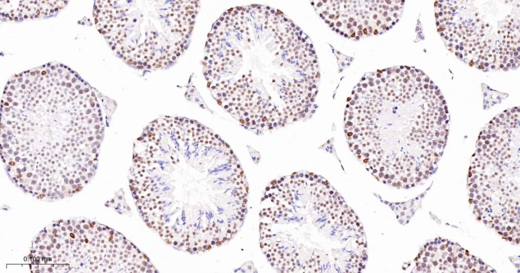 Immunohistochemical analysis of paraffin embedded Mouse testis tissue slide using IHC0691 (Cleaved PARP1 p85 Kit).