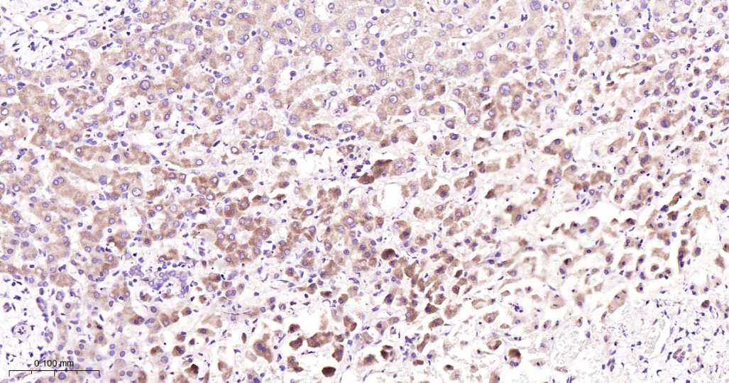 Immunohistochemical analysis of paraffin embedded Human liver tissue slide using IHC0696 (BNIP3 Kit).