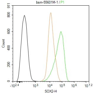 The NCCIT (H) cells were fixed with 4% PFA (10 min at r.t.) and then permeabilized with 90% ice-cold methanol for 20 min at -20℃,the cells then were incubated in 5%BSA to block non-specific protein-protein interactions (30 min at r.t.), followed by secondary antibody incubation for 40 min at room temperature. Primary Antibody (green):Mouse Anti-SOX2 antibody (bsm-55601M,1:100); Isotype Control (orange): Mouse IgG (bs-0296P). Blank control (black): PBS. Acquisition of 20,000 events was performed.