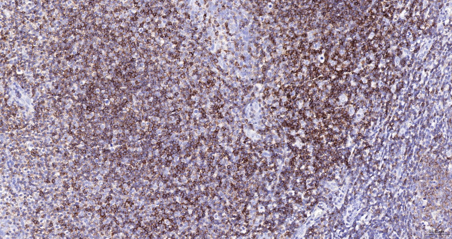 Paraformaldehyde-fixed, paraffin embedded Human Lymph; Antigen retrieval by boiling in sodium citrate buffer (pH6.0) for 15 min; The section was incubated with CD45 Polyclonal Antibody (bs-0522R-HRP) at 1:200 overnight at 4°C, and DAB (C-0010) staining.