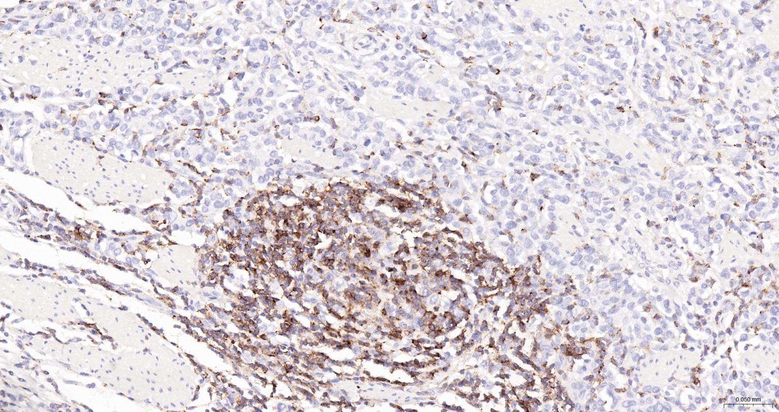 Paraformaldehyde-fixed, paraffin embedded Human Gastric Cancer; Antigen retrieval by boiling in sodium citrate buffer (pH6.0) for 15 min; The section was incubated with CD45 Polyclonal Antibody (bs-0522R-HRP) at 1:200 overnight at 4°C, and DAB (C-0010) staining.