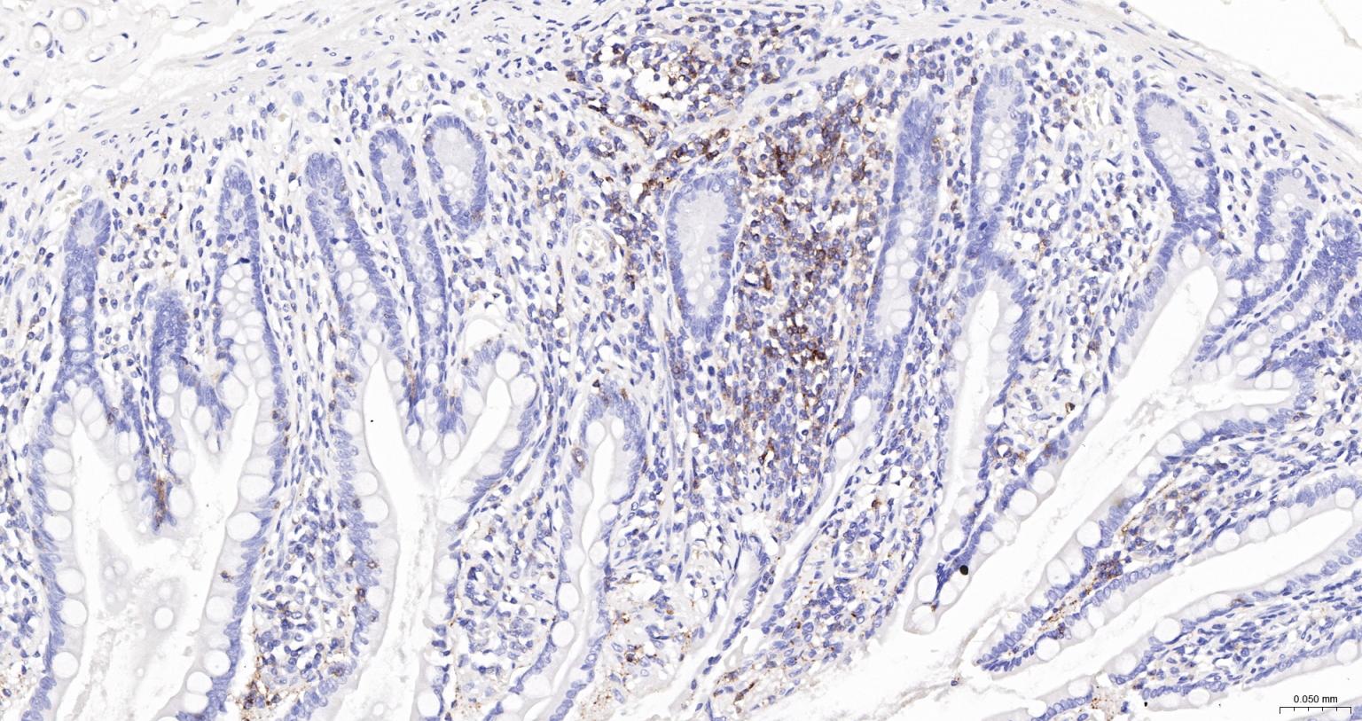 Paraformaldehyde-fixed, paraffin embedded Human Small Intestine; Antigen retrieval by boiling in sodium citrate buffer (pH6.0) for 15 min; The section was incubated with CD45 Polyclonal Antibody (bs-0522R-HRP) at 1:200 overnight at 4°C, and DAB (C-0010) staining.