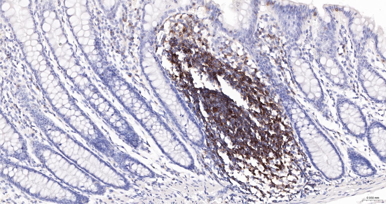 Paraformaldehyde-fixed, paraffin embedded Human Colon; Antigen retrieval by boiling in sodium citrate buffer (pH6.0) for 15 min; The section was incubated with CD45 Polyclonal Antibody (bs-0522R-HRP) at 1:200 overnight at 4°C, and DAB (C-0010) staining.