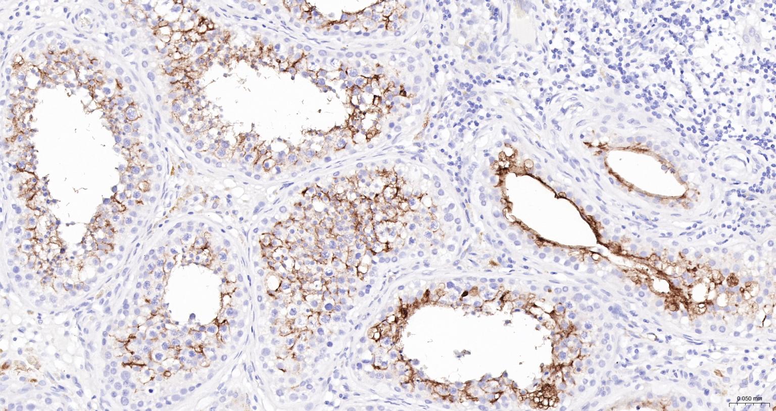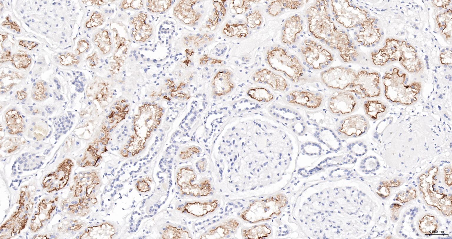 Paraformaldehyde-fixed, paraffin embedded Human Kidney; Antigen retrieval by boiling in sodium citrate buffer (pH6.0) for 15 min; The section was incubated with ACE2 Monoclonal Antibody (bs-1004R-HRP) at 1:200 overnight at 4°C, and DAB (C-0010) staining.