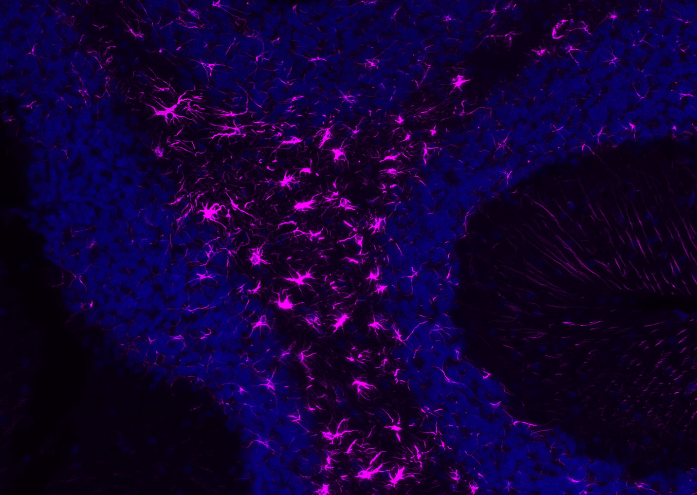 Paraformaldehyde-fixed, paraffin embedded (mouse cerebellum); Antigen retrieval by boiling in sodium citrate buffer (pH6.0) for 15min; Blocking buffer (normal goat serum) at 37°C for 30min; Incubation: Anti- GFAP /cy5 Antibody, conjugated (bs-0199R-Cy5) at 1:200 overnight at 4°C; DAPI (5ug/ml, blue, C-0033) was used to stain the cell nuclei.