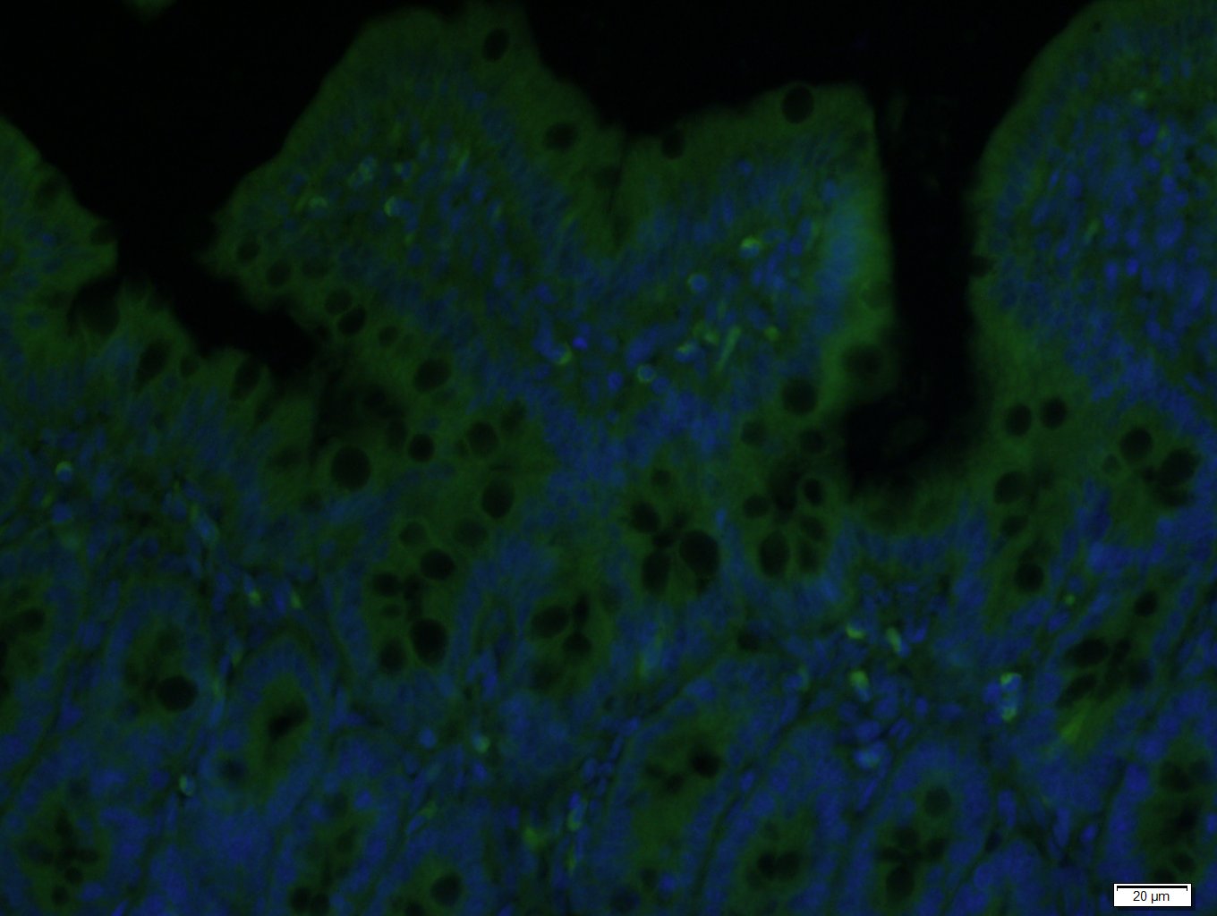 Paraformaldehyde-fixed, paraffin embedded (Rat colon); Antigen retrieval by boiling in sodium citrate buffer (pH6.0) for 15min; Block endogenous peroxidase by 3% hydrogen peroxide for 20 minutes; Blocking buffer (normal goat serum) at 37°C for 30min; Incubation: Anti-ZAK Antibody, conjugated (bs-13546R-BF488) 1:400, 1.5 hours at 37°C; DAPI (5ug/ml, blue, C-0033) was used to stain the cell nuclei.