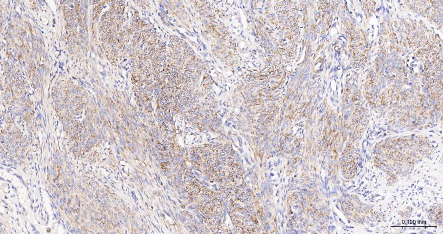 Paraformaldehyde-fixed, paraffin embedded Human Uterus; Antigen retrieval by boiling in sodium citrate buffer (pH6.0) for 15 min; The section was incubated with beta-Actin Monoclonal Antibody (bsm-33036M-HRP) at 1:200 overnight at 4°C, and DAB (C-0010) staining.